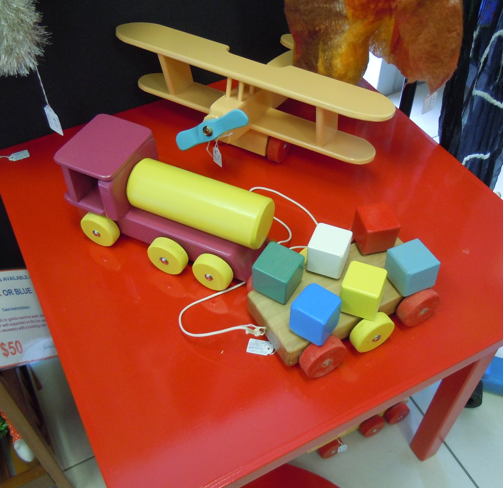 There's nothing like wooden toys that are made for sturdy and tough play. Boys love them, girls do too! These toys are handmade by the blokes at Mud Flat Toys. They're mostly retired grandfathers who delight in making toys the old fashioned way. We have planes from $35, trains from $30, pull-along cubes that rotate from $25, not to mention tables and chairs in bright colours. Call in soon. You won't be able to resist them! |