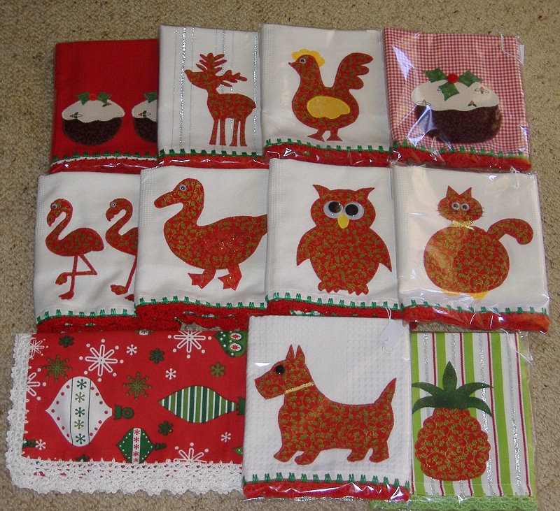A variety of appliqued and crocheted Christmas tea towels by Lorraine McAlister.