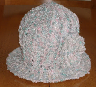 Lovely hand crocheted cloche hat by Lorraine Mc in variegated pastel cotton. Fits small child.