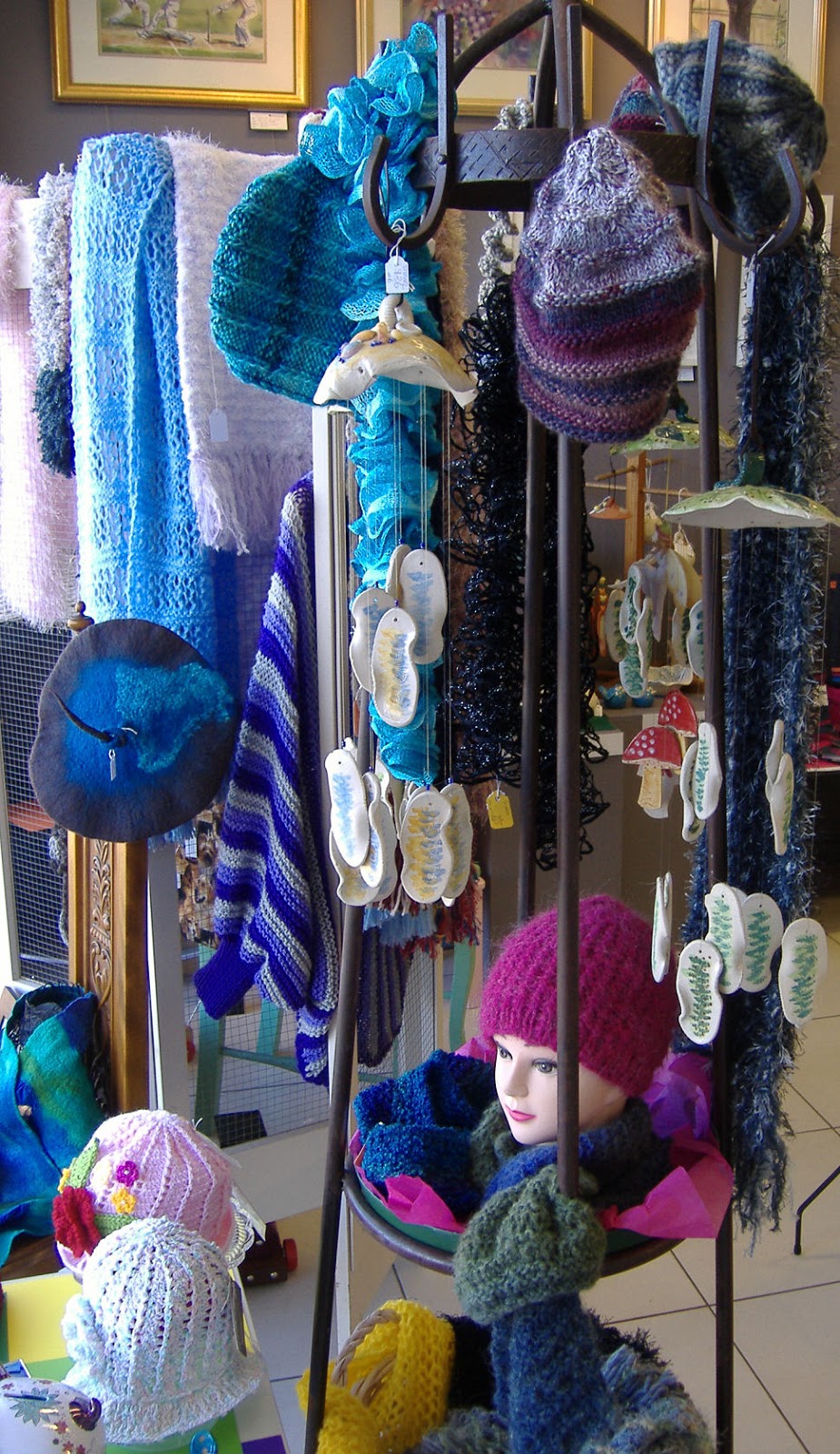 Hand crafted scarves & hats by Sue Shepherd. Pottery wind chimes by Jan Steer.
