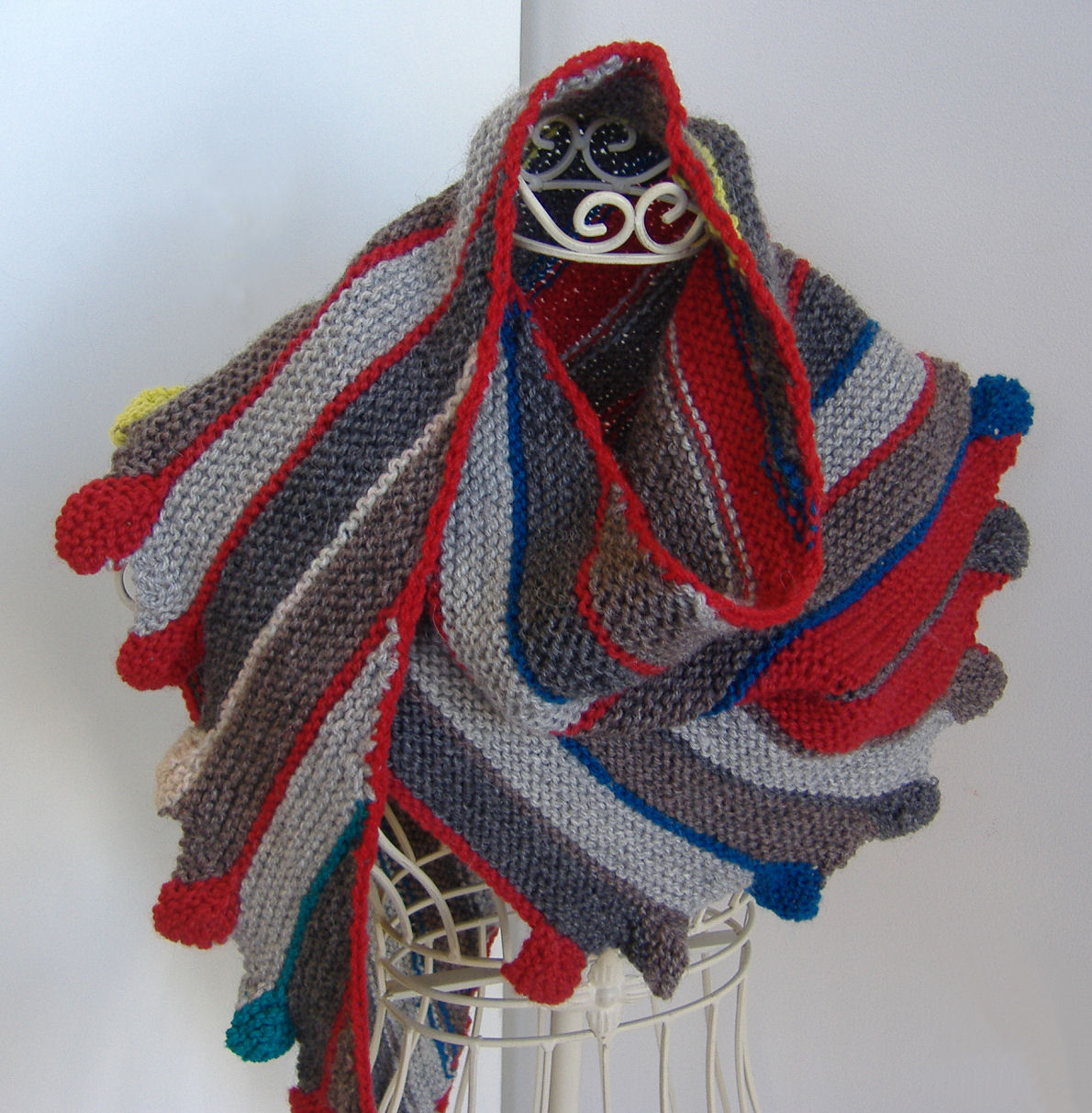 New from Jonna MacFadyen - pure wool, hand knitted shawl. "Leftie" (pattern by Martina Behm). A cute asymmetrical shawl using odd and leftover yarn.