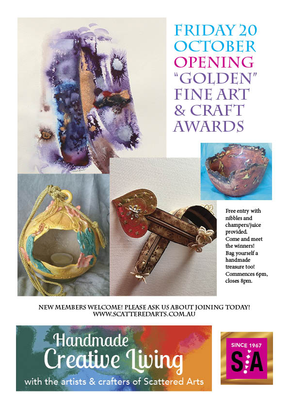 | Friday 20 October from 6pm is when the winners of the SA Prize Categories will be announced. Please join us for nibbles and champers/juice to celebrate with the winners. The quality of this year's entries has been outstanding so definitely worth a look. All entries are for sale, so imagine taking home a work of pure beauty! |